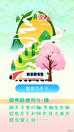 GYCH, A digital illustration featuring a high-speed train traveling through a lush, green landscape with blooming cherry blossoms. The train, with a sleek, modern design, is predominantly white with yellow accents. The background showcases rolling hills and a bright blue sky with fluffy white clouds. Cherry blossom trees in full bloom frame the scene, adding vibrant pink hues. Japanese text is present on the right side, with a small, stylized tree icon. The overall style is vibrant and colorful, with a focus on nature and modern transportation.