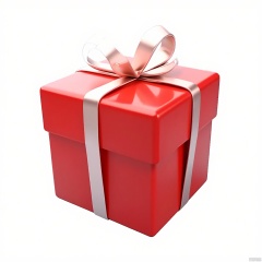 LH, A small, red gift box with a shiny, reflective surface, tied with a pale pink ribbon and a bow. The box is floating in mid-air against a white background. The image has a minimalist, clean aesthetic with a focus on the gift box. The lighting is soft and even, highlighting the smooth texture of the box and the delicate details of the ribbon. The overall style is simple and elegant, with a sense of anticipation and celebration.