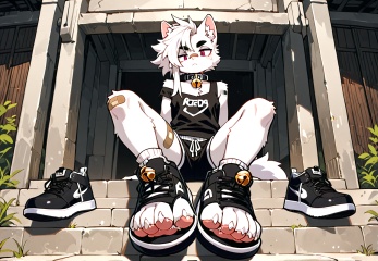 furry,white fur,cat boy,white hair,Right mid length drooping frontal hair,(Asymmetric hair on the temples:1.2),Expose left shoulder,wristband,thick eyebrows,barcode tattoo,bell on collar,Collar,Cortical collar,Large collar,white hair,bandage on nose,bandage on leg,ankle tie bell,shoes focus,wear open toe shoes,<lora:FURRY工坊β:1>,