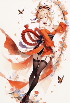 colorink,masterpiece,best quality,amazing quality,very aesthetic,sharp focus,high-end texture,(very awa,year 2024,newest,highres,absurdres), yoimiya_(genshin_impact), genshin_impact, 1girl, blonde_hair, yellow_eyes1girl,solo,long hair,narrow waist,long eyelashes,earring,smile,looking at viewer,lips,dress,seductive smile,parted lips,jewelry,hair clip,bracelet,hair ornament,flower,***,butterfly,falling petals,ace-trim,garter straps,thighhighs,full body,dynamic pose,(strap slip),off shoulder,long_sleeves,simple background,
