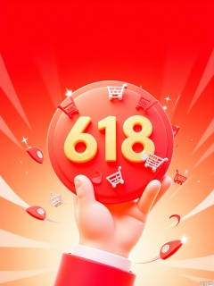 A dynamic, eye - catching digital illustration showcasing a hand grasping a shiny red circular badge marked "618". The badge is overflowing with tiny, red and silver shopping carts, some of which are zooming around in the air, adding a touch of liveliness. The background is a gradient of warm red and gold, amplifying the festive mood. The hand is held high, as if presenting a great offer. The overall style is lively and energetic, blending bold and metallic hues. The image exudes a sense of grandeur and shopping fervor.
