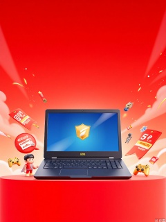 Digital illustration of a high - end gaming laptop against a dynamic red and gold background. The laptop has a shiny gold logo and is positioned in the center, with its keyboard backlit in a cool blue. Surrounding the laptop are various 618 e - commerce elements, such as golden game controllers, red - bordered game discount banners, and a small superhero - themed figurine with a "618 Gaming Deals" sign. The background displays a gradient sky with golden game - inspired particles swirling and a few cloud - shaped images of popular game characters. The overall style is energetic and celebratory, focusing on the excitement of 618 gaming sales.