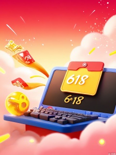 DSYX, Digital illustration of a high - end gaming laptop against a dynamic red and gold background. The laptop has a shiny gold logo and is positioned in the center, with its keyboard backlit in a cool blue. Surrounding the laptop are various 618 e - commerce elements, such as golden game controllers, red - bordered game discount banners, and a small superhero - themed figurine with a "618 Gaming Deals" sign. The background displays a gradient sky with golden game - inspired particles swirling and a few cloud - shaped images of popular game characters. The overall style is energetic and celebratory, focusing on the excitement of 618 gaming sales.