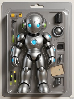 A 3D rendered figure of a robot named Bolt-9000, wrapped in a plastic box. The robot had a sleek silver body with blue LED lights and was equipped with a jetpack and a laser blaster. It was holding a holographic map. The box also contained a power cell and a set of spare parts. The background is a futuristic metallic gray surface. The style is sleek and modern, with an emphasis on the technological and functional packaging of the character.