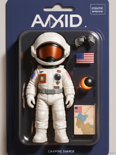 WJSB, A 3D rendering of an astronaut named Captain Cosmos, wrapped in a plastic box. Captain Cosmos had a sleek white spacesuit with an American flag patch, a helmet with a reflective visor, and a jetpack. He was holding a model of the moon. The box also contained a map of the solar system and a rock sample from Mars. The background is a deep black and silver surface. The style is cosmic and adventurous, with an emphasis on the exploratory and scientific packaging of the character.