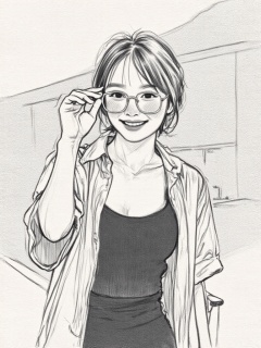 A pencil drawing of a young woman with short, messy hair and glasses, wearing a loose shirt and a black top underneath, smiling and holding her glasses in her right hand. The background is a minimalist interior with a modern design, featuring a kitchen counter with a bowl and a chair. The drawing has a sketchy, rough texture. The woman has a playful and confident expression., <lora:铅笔画_人物_flux版:1>