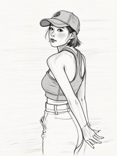 A pencil drawing of a young woman with a slender build, wearing a baseball cap, a sleeveless crop top, and high-waisted pants. She has short, dark hair and is looking over her shoulder with a thoughtful expression. The background is minimalistic and sketchy, with a horizontal line suggesting the ground. The drawing is detailed and realistic, with shading that adds depth and dimension. The woman's skin is fair, and her facial features are delicate. The overall mood is introspective and artistic., <lora:铅笔画_人物_flux版:1>