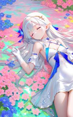 1girl,solo,long hair,gloves,dress,bare shoulders,closed eyes,flower,white hair,lying,detached sleeves,pointy ears,white dress,sleeping,(wlop:0.8),((artist:reoen),(artist:fuzichoco),(artist:atdan),(artist:torino_aqua),year 2024:0.8),[artist:wlop],[artist:ningen_mame],artist:ciloranko,[[artist:rhasta]],artist:tidsean,colorful,best quality,very aesthetic,absurdres,32K UHD,sharp focus,best-quality,Emotionalization,temperate atmosphere,with a high-end texture,in the style of fashion photography,Dynamic,dynamic force picture,(Visual impact:1.2),impactful picture,