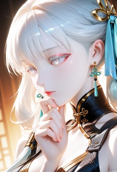 1girl, jinhsi \(wuthering waves\), earrings,black collar, black dress, hand up, jewelry, white hair, long hair, white eyes, portrait, colored eyelashes, thinking, backlighting, pale skin,translucent,realistic,white skin,high detailed skin,(detailed skin:1.1),highly detailed,ultra-high resolution,32K UHD,sharp focus,best-quality,masterpiece,unconventional supreme masterpiece,masterful details,temperate atmosphere,with a high-end texture,in the style of fashion photography,Dynamic Angle,(Dynamic posture:1.1),