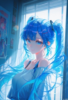 1girl, solo, long hair, looking at viewer, smile, bangs, blue eyes, hair ornament, twintails, blue hair, upper body, hairclip, indoors, glitch ,backlighting,blue and white theme,depth of field,cinematic lighting,light particles,lens flare, (artist:quasarcake:0.8),extreme aesthetic,(wlop:0.6),masterpiece,best quality,good quality,newest,year 2024,year 2023,very aesthetic,absurdres,Visual impact,A shot with tension, ultra-high resolution,32K UHD,sharp focus,best-quality,masterpiece,Emotionalization,unconventional supreme masterpiece,masterful details,temperate atmosphere,with a high-end texture,in the style of fashion photography, (Visual impact:1.2),giving the poster a dynamic and visually striking appearance,impactful picture,offcial art,colorful,splash of color,movie perspective, masterpiece,best quality,amazing quality,very aesthetic,absurdres,best quality,newest,
