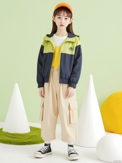 ETMT, A young girl with straight brown hair, wearing a green and navy jacket, tan shorts, black sneakers, and an orange cap, stands in a whimsical setting. She has a neutral expression and is surrounded by three white, cone-shaped trees and a large, fluffy yellow mushroom. The background is a soft, light green, and she is standing on a patch of green grass. The overall style is playful and imaginative, with a soft, pastel color palette.