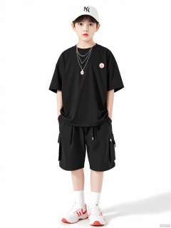 ETMT, A young boy stands confidently in front of a plain white background, wearing a black t-shirt with a small red and white logo on the left chest, black shorts, white sneakers with red accents, and a white cap with a black "NY" logo. He has short dark hair and is wearing multiple necklaces, including a silver chain with a small pendant and another with a skull charm. The boy's hands are in his shorts pockets, and he has a relaxed, casual stance. The overall aesthetic is trendy and youthful.