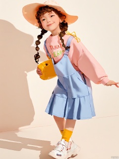 ETMT, Photo of a young girl with curly brown hair in braids, wearing a large, floppy, yellow and white hat, a cream-colored sweater with colorful, whimsical text and graphics, and a light blue, pleated skirt. She is also wearing white sneakers with yellow socks. The girl is walking confidently, smiling, with a playful and carefree expression. The background is a plain white studio setting with a minimalistic, clean aesthetic. The lighting is bright and even, emphasizing the girl's cheerful demeanor. The overall style is casual and playful.