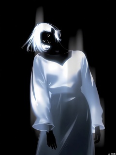 FSWL, A surreal, abstract digital artwork featuring a woman with a flowing white dress and a short bob haircut. The dress is glowing with a soft, ethereal light. The woman's face is partially obscured by shadows, giving her a mysterious, otherworldly appearance. The background is dark, enhancing the contrast and making the glowing elements stand out. The style is reminiscent of surrealist art, with a dreamy, almost ghostly atmosphere. The image has a high-contrast, low-light aesthetic with a focus on the interplay between light and shadow.