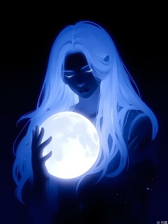 FSWL, A digital painting featuring a silhouetted woman with long, flowing hair holding a glowing, full moon. The woman's silhouette is detailed, with a soft, ethereal glow emanating from her, creating a halo effect. The moonlight illuminates her face, highlighting her serene expression. The background is a deep, starry night sky, adding to the mystical atmosphere. The image has a dreamy, otherworldly quality, with a focus on contrast and light. The style is reminiscent of fantasy art, with a strong emphasis on ethereal beauty and cosmic themes.