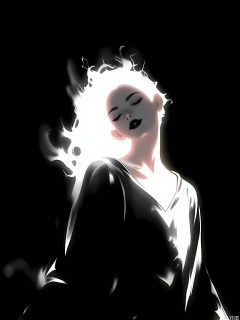 FSWL, A surreal digital painting of a woman with her head tilted back, eyes closed, and long, flowing hair blending into a fiery halo of light. She has a calm, serene expression, and her skin is illuminated by the ethereal glow. The background is a deep, textured black, enhancing the mystical and otherworldly atmosphere. The style is abstract and expressive, with a focus on light and shadow. The image has a dreamlike quality, evoking a sense of tranquility and inner peace.
