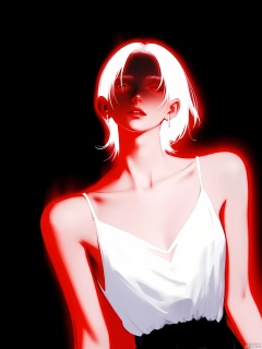 FSWL, A digital painting of a woman with long, straight, white hair, wearing a white, sleeveless top with thin straps. The background is black, and the woman's figure is highlighted with red and white lighting, creating a striking contrast. The lighting emphasizes her slender physique and the contours of her face and body. Her expression is serene, with her eyes closed and lips slightly parted. The artwork has a surreal, ethereal quality, with a focus on light and shadow. The style is reminiscent of modern digital art with a high-contrast, minimalist aesthetic.