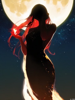 FSWL, A digital painting featuring a silhouetted woman with long, flowing hair holding a glowing, full moon. The woman's silhouette is detailed, with a soft, ethereal glow emanating from her, creating a halo effect. The moonlight illuminates her face, highlighting her serene expression. The background is a deep, starry night sky, adding to the mystical atmosphere. The image has a dreamy, otherworldly quality, with a focus on contrast and light. The style is reminiscent of fantasy art, with a strong emphasis on ethereal beauty and cosmic themes.