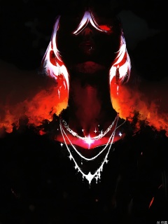 FSWL, Digital illustration of a young woman with long, straight, white hair and bangs. She has a blank expression, with her eyes glowing white and star-like sparkles around her face. She wears a black top and multiple thin necklaces with small star-shaped pendants. The background is black, making her glow stand out. The style is dark and moody, with a surreal, otherworldly feel. The image is high contrast, with a grainy texture. The woman's face is illuminated by the glowing effect, creating a mystical, dreamy atmosphere.