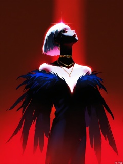 FSWL, Photograph of a woman with short, white hair, wearing a black feathered outfit and a gold necklace, standing against a bright red background. Her head is tilted back, and she has a serene expression. The lighting creates a glowing halo effect around her head, emphasizing her ethereal presence. The image has a dreamy, surreal quality with a strong contrast between the dark clothing and the vibrant background. The style is reminiscent of fashion photography with a touch of fantasy.
