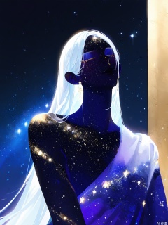 FSWL, A digital illustration of a woman with long, flowing white hair and a deep blue, starry skin tone. Her eyes are closed, and she has a serene, almost ethereal expression. The background is a deep red, creating a stark contrast with the bright, luminous hair and skin. The style is reminiscent of fantasy or sci-fi art, with a focus on celestial themes. The woman's hair and skin are detailed with a shimmering effect, giving the impression of a starry night sky. The overall mood is peaceful and otherworldly.