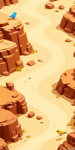 YXCJ, A vibrant, cartoon-style digital illustration of a desert canyon scene with winding, sandy paths and towering, reddish-brown rock formations. A small, blue bird perches on a rock formation in the upper left, while a yellow bird flies near the winding path in the lower right. Sparse vegetation is scattered throughout the canyon. The background features additional rock formations and a sense of depth, with the path winding through the landscape. The colors are warm and earthy, with a bright, sunny atmosphere. The art style is whimsical and playful, with smooth lines and a sense of adventure.