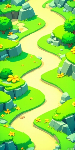 YXCJ, A vibrant, colorful digital illustration of a winding path through a lush, green landscape. The path is flanked by grassy hills and rocky outcrops, with small, colorful flowers scattered throughout. The style is cartoony and whimsical, with bright, saturated colors and exaggerated shapes. The image is highly detailed and features a variety of textures, from the rough rocks to the soft grass. The path curves gently, leading the viewer's eye through the scene. The sky is not visible, and the focus is entirely on the terrain.