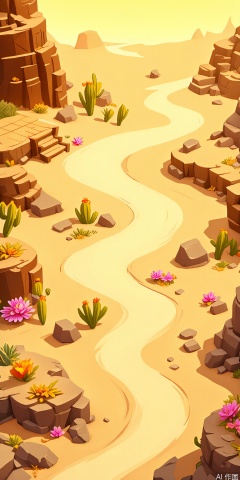YXCJ, A vibrant, detailed digital illustration of a desert scene featuring a winding dirt path with a small, colorful flowerbed along the side. The path is flanked by rocky outcrops and cacti, with a small wooden bridge crossing over a dry riverbed. The sky is a warm yellow, indicating either sunrise or sunset. The style is reminiscent of a cartoon or animated film, with bold colors and smooth shading. The scene is peaceful and inviting, with a sense of adventure and exploration.