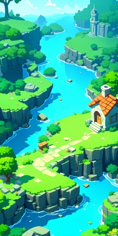 YXCJ, A vibrant, colorful pixel art landscape featuring lush greenery, a small stone house with a red roof, and a serene river flowing through rocky cliffs. The scene is set in a fantasy world with a waterfall in the distance and a castle-like structure on a hill. The sky is clear with a few fluffy clouds. The overall style is whimsical and charming, with a playful, cartoonish aesthetic.