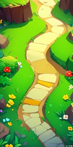 YXCJ, A vibrant, colorful digital illustration of a winding path through a lush, green landscape. The path is flanked by grassy hills and rocky outcrops, with small, colorful flowers scattered throughout. The style is cartoony and whimsical, with bright, saturated colors and exaggerated shapes. The image is highly detailed and features a variety of textures, from the rough rocks to the soft grass. The path curves gently, leading the viewer's eye through the scene. The sky is not visible, and the focus is entirely on the terrain.