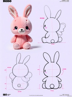 A digital rendering of a peculiar plush animal with a fluffy, cotton-candy pink body, multiple rabbit-like ears of varying lengths, and a pair of butterfly wings sprouting from its back. The animal is depicted in stances: leaping, curled up sleeping, and from a side profile showing its wings. The illustration encompasses a 3D model view, a meticulous line drawing highlighting its dreamy features, and a complete body sketch. The animal boasts a cute and fantastical design, outlined in a pastel pink line with gentle shading to add depth. The background is a light lavender, creating a whimsical atmosphere suitable for a fantasy-themed toy or storybook character.