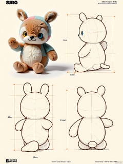 A digital illustration of a quirky plush creature with a patchwork body made of different fabrics, mismatched button eyes, and a pair of oversized mittens for hands. The creature is shown in multiple postures: waving, hugging itself, and from a back view showing its stitched seams. The artwork includes a 3D model perspective, a detailed line drawing highlighting its handmade charm, and a full-body sketch. The creature features a cute and homemade design, outlined in a warm brown line with light shading to add texture. The background is a cream-colored fabric texture, providing a cozy setting suitable for a handmade toy or craft project.