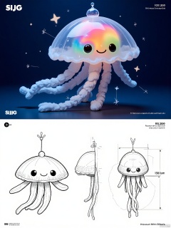 A digital depiction of a strange plush animal with a translucent, jellyfish-like body filled with swirling colors, long tentacles trailing behind, and a small crown-like structure on top. The animal is presented in various poses: floating, gently pulsating, and from a bottom-up view. The illustration comprises a 3D model view, an intricate line drawing focusing on its ethereal beauty, and a full-body sketch. The animal has a mesmerizing and otherworldly design, outlined in a soft white line with minimal shading to maintain its transparency. The background is a deep navy blue, dotted with stars, creating an underwater atmosphere suitable for a marine-themed toy or decorative item.