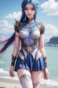 1girl, solo, long hair, blue eyes, hair ornament, dress, closed mouth, blue hair, ponytail, multicolored hair, gradient hair,masterpiece,best quality,official art,extremely detailed CG unity 8k wallpaper,Thigh exposed,thighhighs,looking at viewer,on the beach,