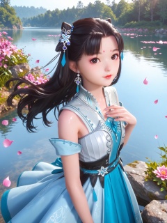 score_9,score_8_up,score_7_up,1girl,looking_at_viewer,realistic,1girl,Vivid Colors,bright environment,sunshine,god light,lake,delicate water surface,hair_ornament,shiny skin,shiny hair,reflection,(wariza:1.2),dress,jewelry,flower sea,falling petals,extreme detail description,bright sunlight,frontal lighting,(upper body:1),put one hand on your chest,black hair
