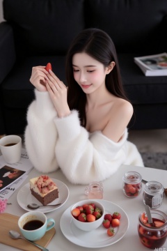 - Figure Posture: Sitting gracefully at the table, with the arm naturally raised to hold a strawberry, the posture is relaxed and elegant, fully demonstrating a gentle temperament.