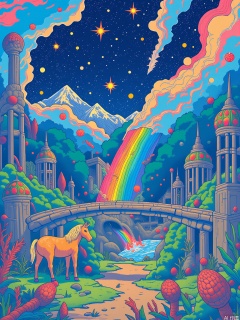 An enchanting digital illustration featuring a centaur with a golden mane and a coat that shifts between forest green and autumn brown, galloping through a meadow in the foreground, while staring at a bridge made of rainbows that leads to a celestial mountain range. The centaur’s hooves leave trails of glowing flowers, and the meadow is dotted with mythical beasts and ancient ruins. The background reveals a sky filled with floating castles, comets, and constellations that form the shapes of forgotten gods. The style is epic and surreal, invoking a sense of grandeur and adventure.