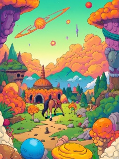 CXS, An enchanting digital illustration featuring a centaur with a golden mane and a coat that shifts between forest green and autumn brown, galloping through a meadow in the foreground, while staring at a bridge made of rainbows that leads to a celestial mountain range. The centaur’s hooves leave trails of glowing flowers, and the meadow is dotted with mythical beasts and ancient ruins. The background reveals a sky filled with floating castles, comets, and constellations that form the shapes of forgotten gods. The style is epic and surreal, invoking a sense of grandeur and adventure.
