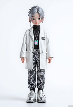 CWIP, A digital chibi character with spiky silver hair and large, joyful eyes. Wearing a white lab coat with black accents, a black turtleneck, and silver metallic pants featuring circuit board patterns. The character sports a holographic ID badge necklace and white sneakers with silver trim, set against a clean white backdrop, reminiscent of futuristic anime style.