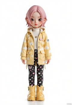 CWIP, Stylized chibi illustration with short, fluffy pink hair and large, soulful eyes. Wearing a pastel yellow raincoat with white clouds print, a white turtleneck, and black leggings adorned with tiny heart motifs. Accessorized with a pearl hairpin and yellow rain boots with white polka dots, against a pristine white background, capturing the whimsy of modern manga design.