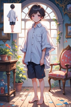 solo, short hair, brown hair, shirt, black hair, 1boy, standing, full body, white shirt, male focus, barefoot, indoors, cosplay, chair, wooden floor, realistic, photo background, reference inset, oversized shirt, photo inset