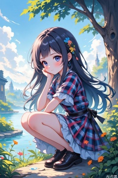 1girl, solo, long hair, black hair, dress, short sleeves, outdoors, day, black footwear, black eyes, tree, plaid, squatting, plant, scenery, head rest, hand on own chin, plaid dress