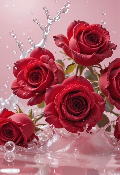 Photograph of a vibrant bouquet of roses in various shades of red, glistening with water droplets that sparkle like diamonds. The flowers are fresh and fragrant, some petals partially submerged in a reflective, rippling water surface below. The background is a gradient of soft pink, enhancing the bouquet's romantic allure. The image is well-lit, emphasizing the roses' velvety texture and the clarity of the water. The composition focuses on the flowers' natural beauty, with water droplets splashing around them, creating a sense of freshness and vitality.