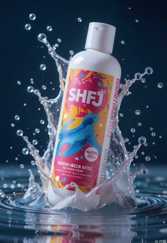 Photograph of a bottle of body wash with a bold, graphic design, splashed with water droplets that create a dynamic and energetic effect. The body wash bottle is vibrant and eye-catching, with a label that features abstract aquatic patterns. Some droplets are flying off the bottle, partially submerged in a reflective, rippling water surface below. The background is a gradient of navy blue, enhancing the body wash's bright colors. The image is well-lit, emphasizing the bottle's glossy finish and the clarity of the water. The composition highlights the body wash's invigorating and refreshing scent.