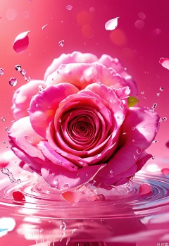 SHFJ, Photograph of a vibrant bouquet of roses in various shades of red, glistening with water droplets that sparkle like diamonds. The flowers are fresh and fragrant, some petals partially submerged in a reflective, rippling water surface below. The background is a gradient of soft pink, enhancing the bouquet's romantic allure. The image is well-lit, emphasizing the roses' velvety texture and the clarity of the water. The composition focuses on the flowers' natural beauty, with water droplets splashing around them, creating a sense of freshness and vitality.