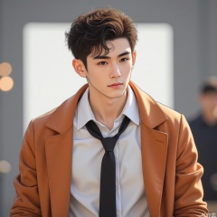 Walking alone, short hair, shirt, brunette, 1 boy, orange jacket, white shirt, upper body, male focus, lips separate, clothes open, tie, neckline shirt, artist name, indoor, blur, lips, window, blur background, formal, suit, messy hair, black tie, sense of reality, tie untied