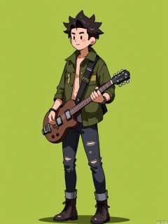 A digital illustration of a young man with dreadlocks and a laid-back attitude, wearing a green camouflage jacket, ripped jeans, and combat boots. He has a guitar slung over his shoulder and is strumming a chord with a relaxed expression. The background is a solid olive green color. The art style is edgy and cartoonish with gritty textures and bold contrasts.