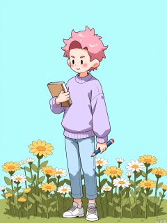 A digital illustration of a young woman with short, pink hair and a dreamy gaze, wearing a pastel lavender sweater, light blue jeans, and white sneakers. She holds a sketchbook in one hand and a pencil in the other, standing in a field of wildflowers. The background is a solid baby blue color. The art style is ethereal and cartoonish with soft gradients and delicate details.