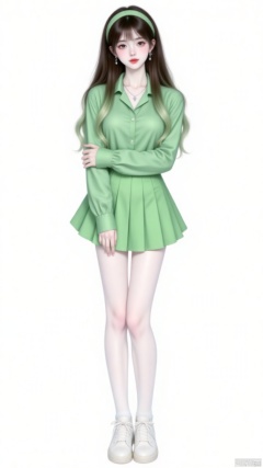 1girl, solo, long hair, breasts, looking at viewer, skirt, simple background, brown hair, shirt, long sleeves, white background, jewelry, standing, collarbone, full body, pantyhose, multicolored hair, pleated skirt, hairband, earrings, green hair, shoes, necklace, gradient hair, white footwear, green skirt, white pantyhose, green shirt
