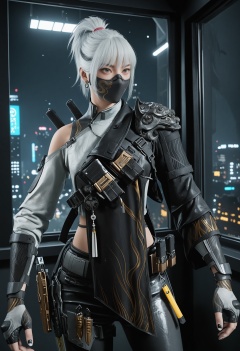 (vision:1.1),(direct_eye_contact:1.1),(looking_at_viewer:1.3),indoors,night,a dim environment,cyberpunk background,ceiling window,in tall buildings,<lora:YQ_li光辉v5_maixiaowen_V5:0.8>,q1528437228,solo,1girl,gloves,mask,ponytail,mouth mask,pants,grey hair,white hair,fingerless gloves,black pants,earrings,armor,black gloves,jewelry,jacket,shoulder armor,shirt,black nails,holster,shoulder cutout,grey eyes,single pauldron,black jacket,belt,long sleeves,sheath,holstered,nail polish,gas mask,short hair,brown eyes,white shirt,black eyes,hair bun,midriff,grey gloves,pauldrons,